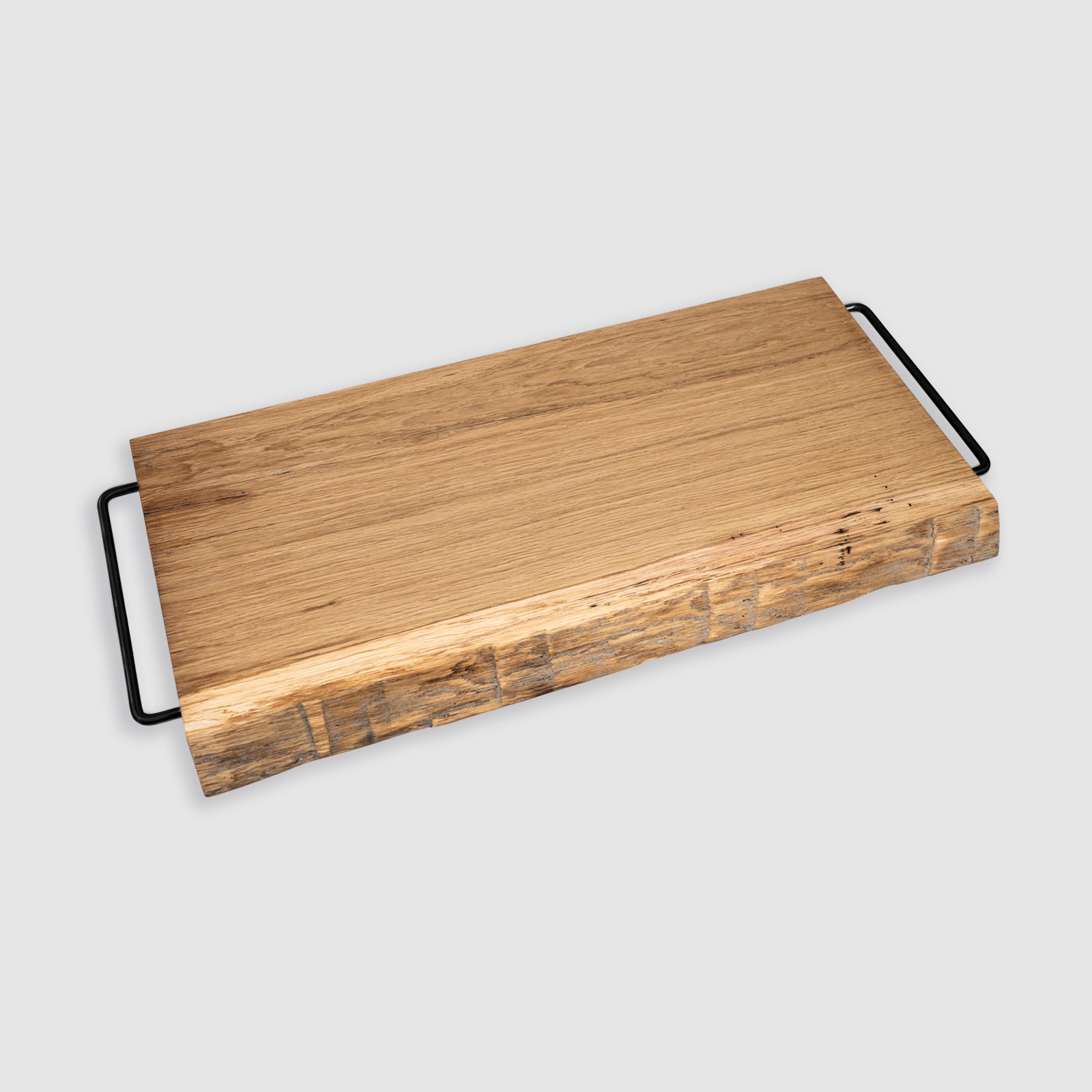 Unser handgefertigtes Vollholz - Eichebrett mit Stahlrundgriffen ist ein zeitloses und robustes Stück, das sowohl funktional als auch ästhetisch ansprechend ist.